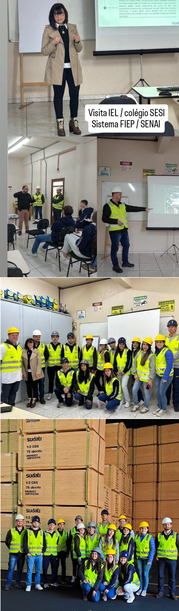 Acompanhados pelo Professor Leandro argenta e pela Analista de Relacionamentos Aline Barreto, representando o IEL, os alunos foram recepcionados pela equipe técnica da Sudati, que apresentou um panorama completo do funcionamento da fábrica — desde a chegada da matéria-prima até o processo final de produção dos compensados. Durante a visita, os estudantes puderam conhecer as etapas do processo do compensado, as tecnologias utilizadas na linha de produção, os cuidados com a sustentabilidade e as rígidas normas de segurança que regem o ambiente industrial.