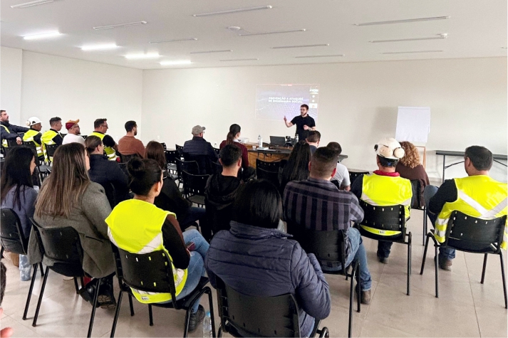 O encontro aconteceu presencialmente na unidade de Palmas-PR, reunindo colaboradores de diversos setores, e também foi transmitido ao vivo para a unidade de São Francisco de Paula-RS, possibilitando que os profissionais participassem simultaneamente, interagindo e enviando perguntas ao palestrante.